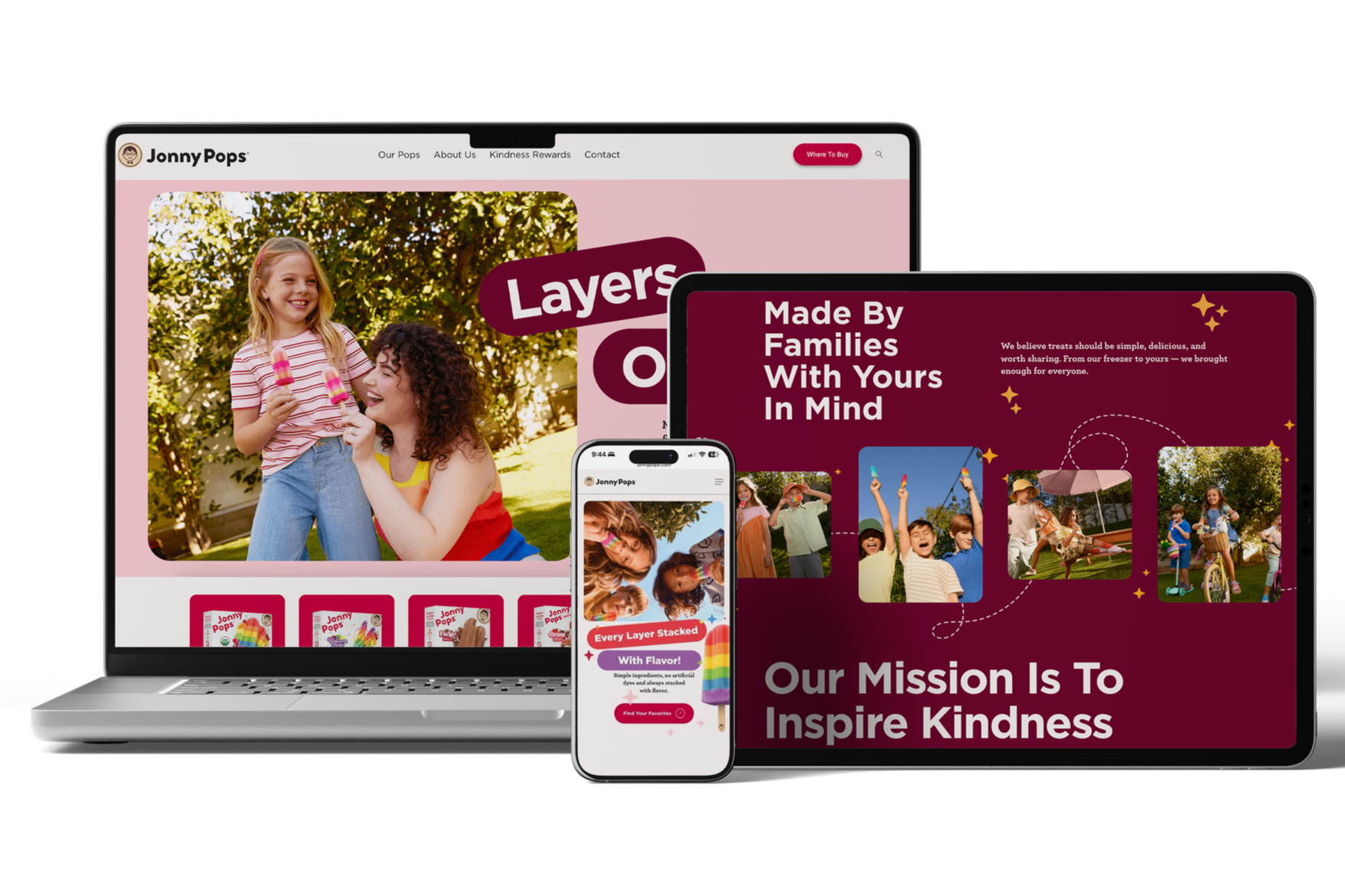The new site brought JonnyPops' digital presence in line with the brand it had grown into, full of color, movement, and personality. Traffic increased. But the most meaningful result came from the Kindness is Golden page, where we completely rethought how we communicated our stick redemption program. The redesigned page and video made the program so much more easily navigated.