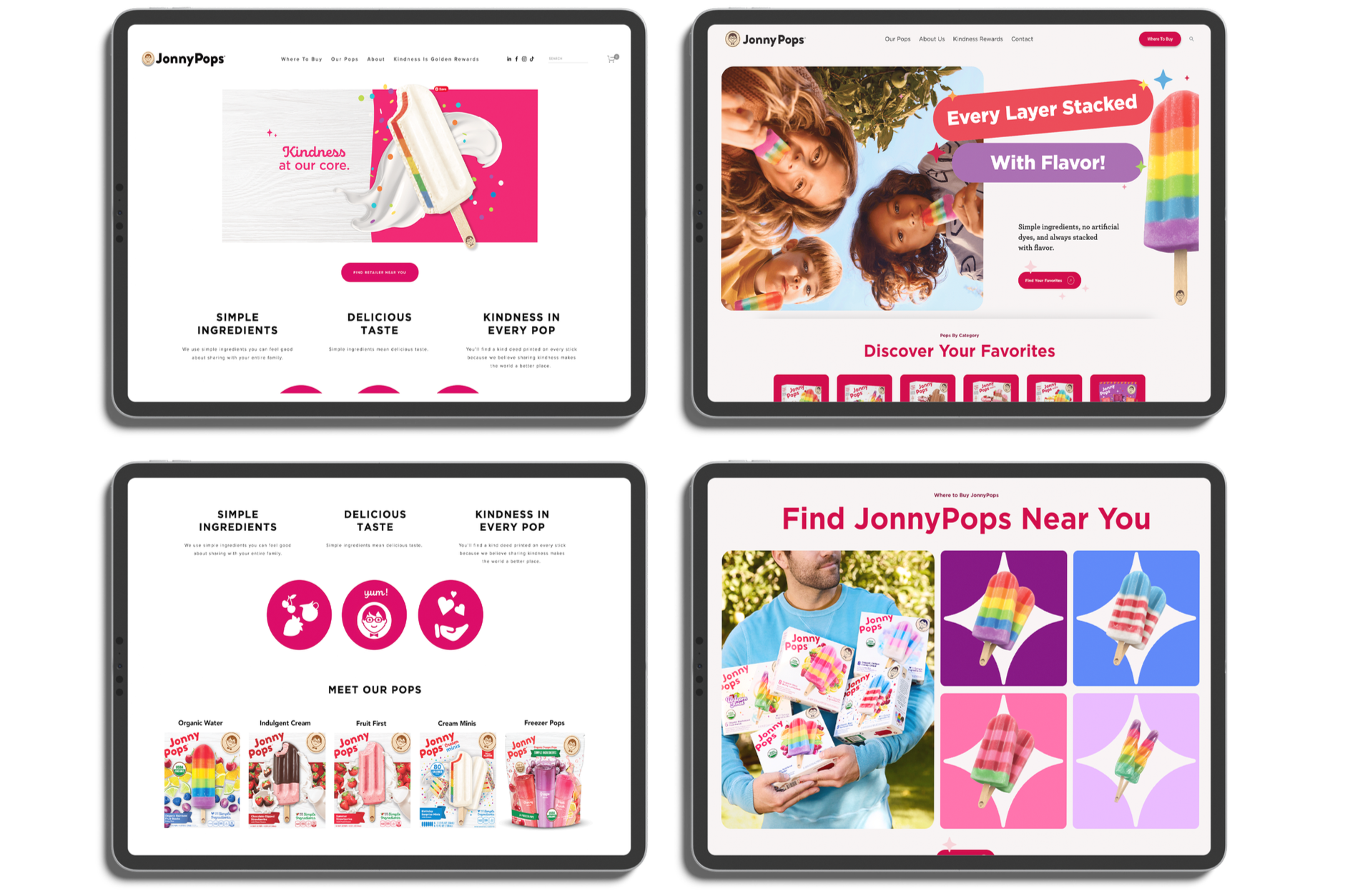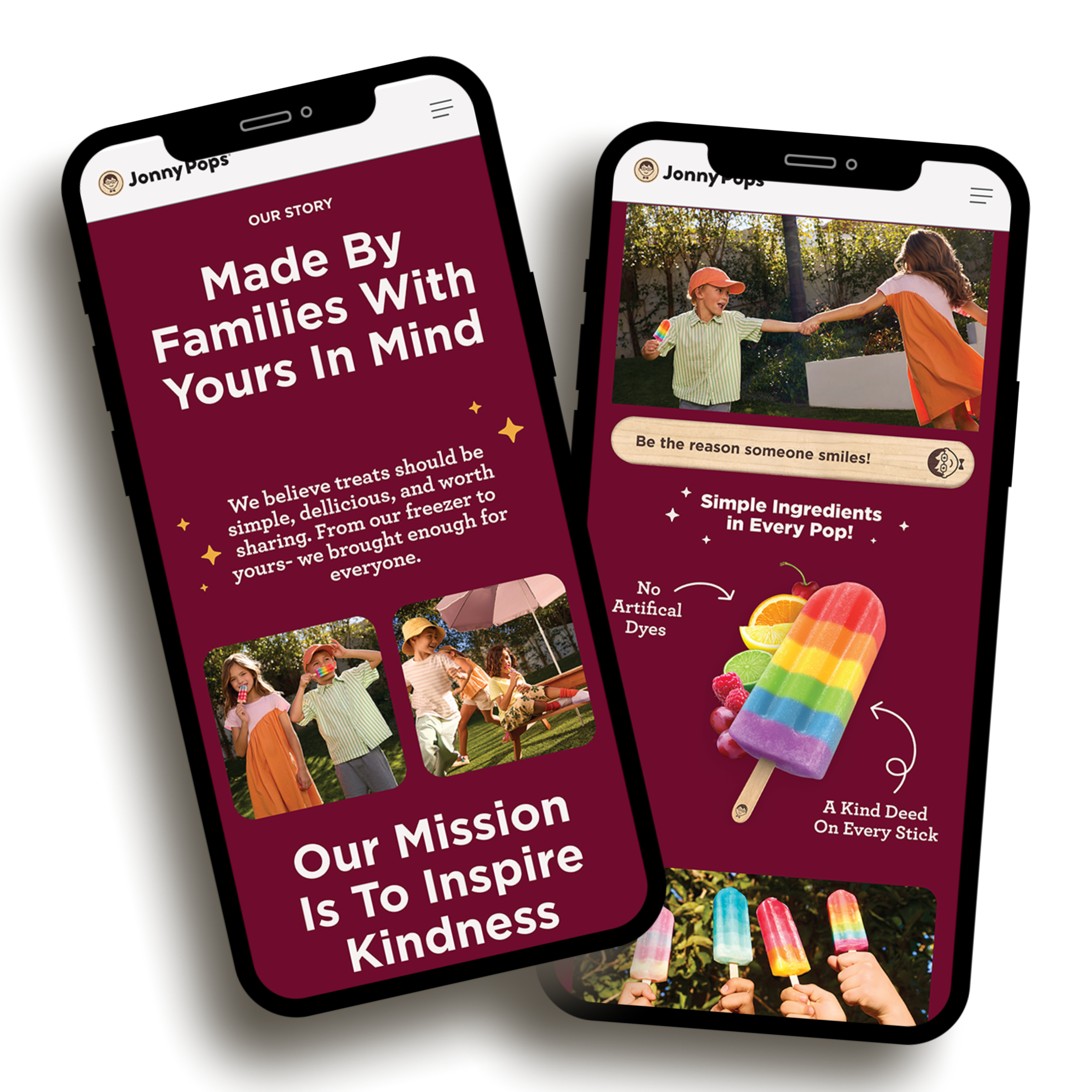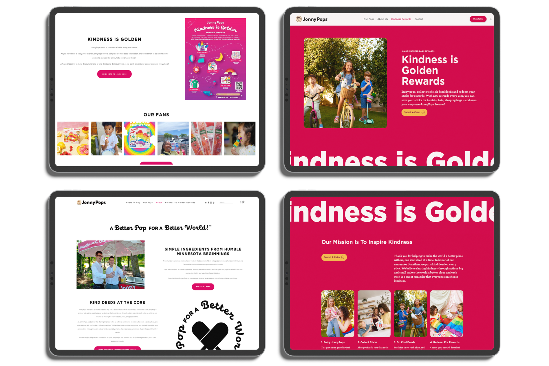 The new site brought JonnyPops' digital presence in line with the brand it had grown into, full of color, movement, and personality. Traffic increased. But the most meaningful result came from the Kindness is Golden page, where we completely rethought how we communicated our stick redemption program. The redesigned page made the process so clear that customer service saw a dramatic drop in inbound calls and emails from people asking how it works.